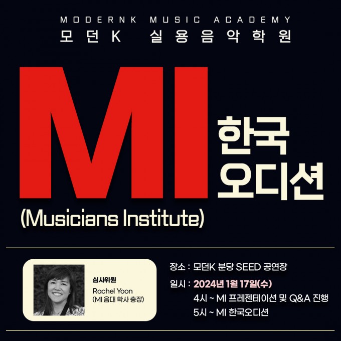 다름이 아니라 이번 1월 17일(수) 분당캠퍼스에서 미국 캘리포니아에 위치하고 있는 MI음대 Rachel Yoon 총장님과 함께 MI 한국오디션 및 학교 소개 프레젠테이션이 진행됩니다.