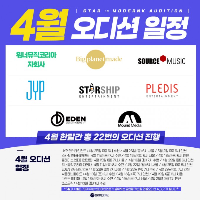JYP, 스타쉽, 플레디스, 쏘스뮤직, 빅플래닛메이드 등 4월 한달간 총 22번의 오디션 진행!
