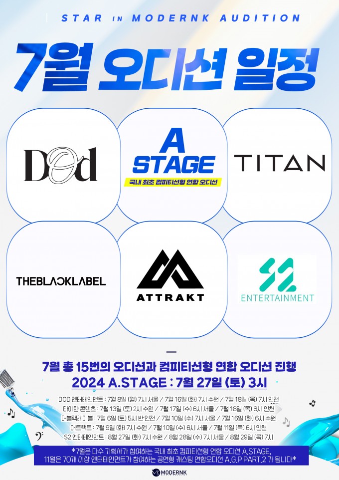 어트랙트, 더블랙레이블, 타이탄콘텐츠, DOD Ent., 컴피티션형 연합오디션 2024 A.STAGE 등 7월 한달간 총 15번의 오디션과 연합 오디션 진행!