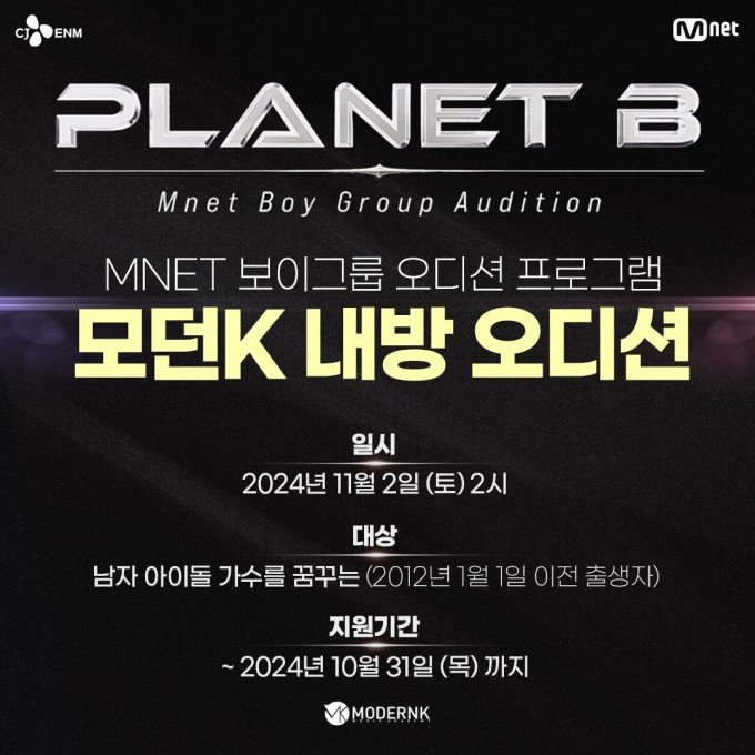 , , , 에 이어 Mnet 에서 선보이는 보이그룹 오디션 프로그램 프리퀄 방송 PLANET B 에서 모던K를 찾아옵니다.
