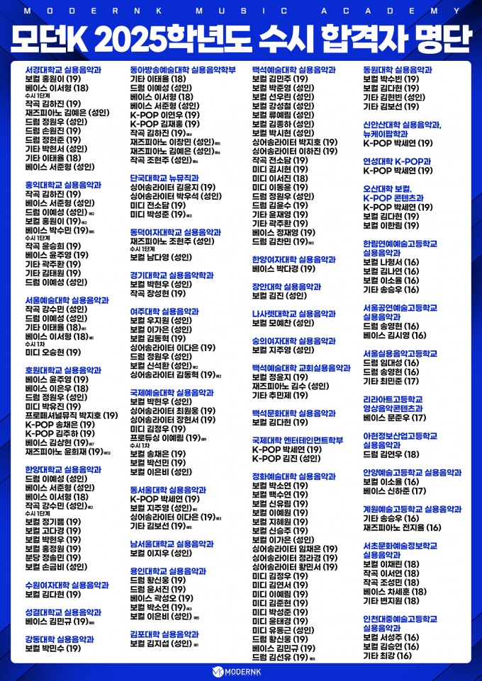 모던K 실용음악학원 2025학년도 수시 합격자 명단