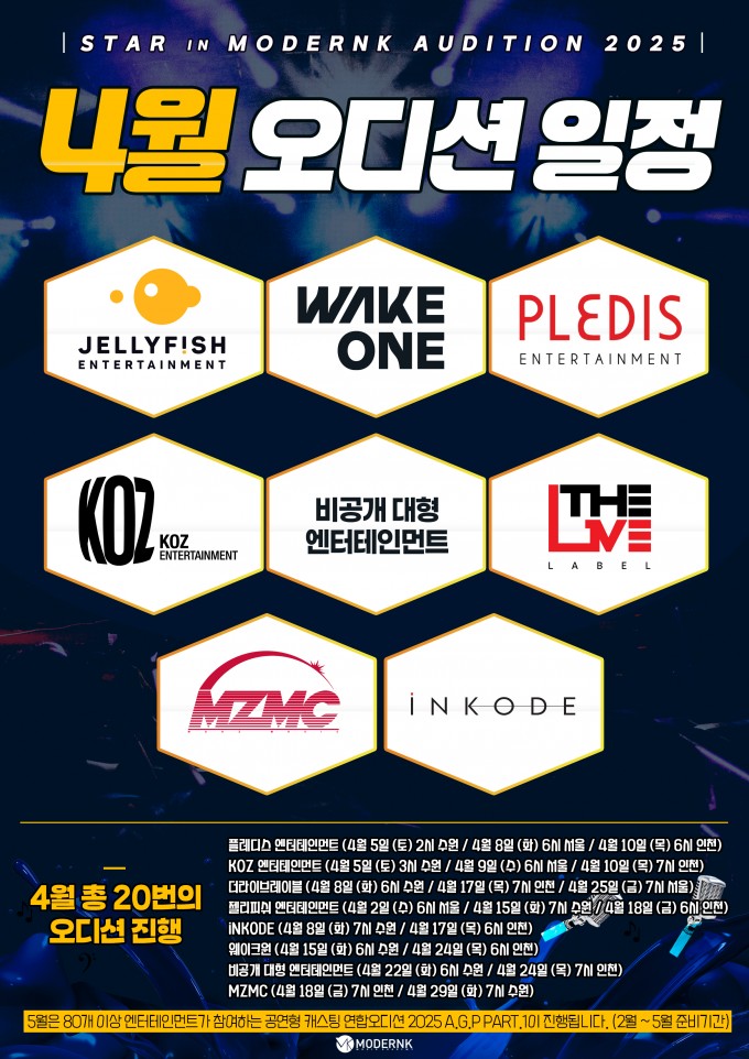 플레디스, KOZ, 젤리피쉬, 웨이크원, 비공개 대형 기획사 등 4월 한달간 총 20번의 오디션 진행!
