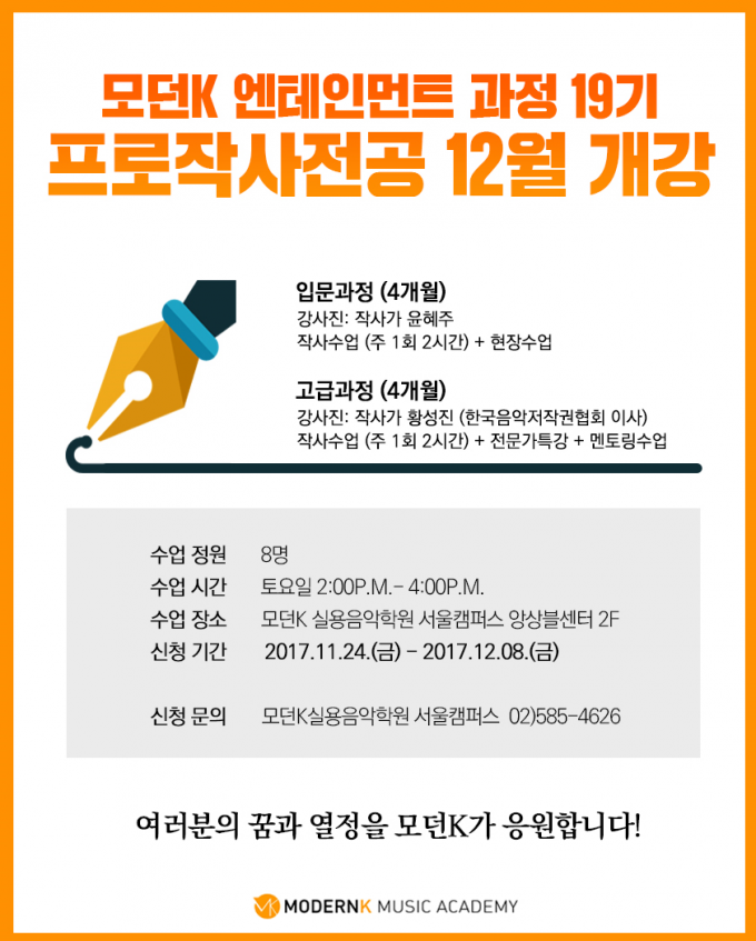 모던K 실용음악학원에서는 11월 24일 개강설명회를 시작으로, 19기 엔터테인먼트과정 수강 신청을 진행하고 있습니다.
