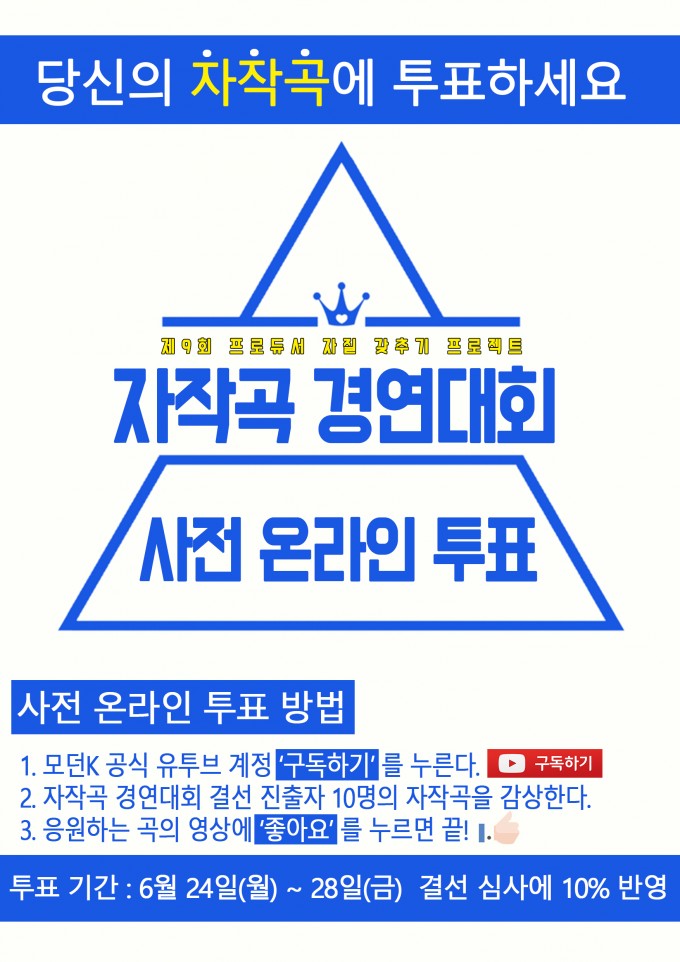 *투표 방법 : 모던K 공식 유투브 계정을 통해 총 10개의 자작곡 감상 후 '좋아요'