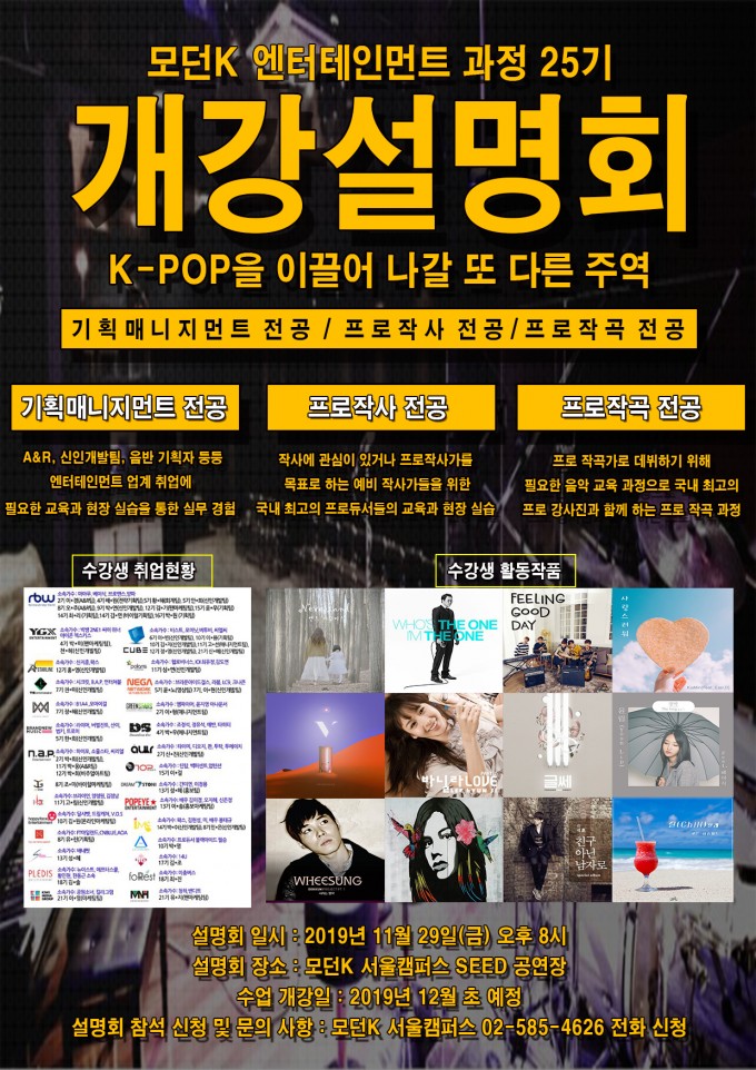 개강에 앞서 총 8개월 과정을 한눈에 볼 수 있는 개강설명회가 11월 29일(금) 오후 8시 모던K 서울캠퍼스 SEED 공연장에서 진행될 예정입니다.