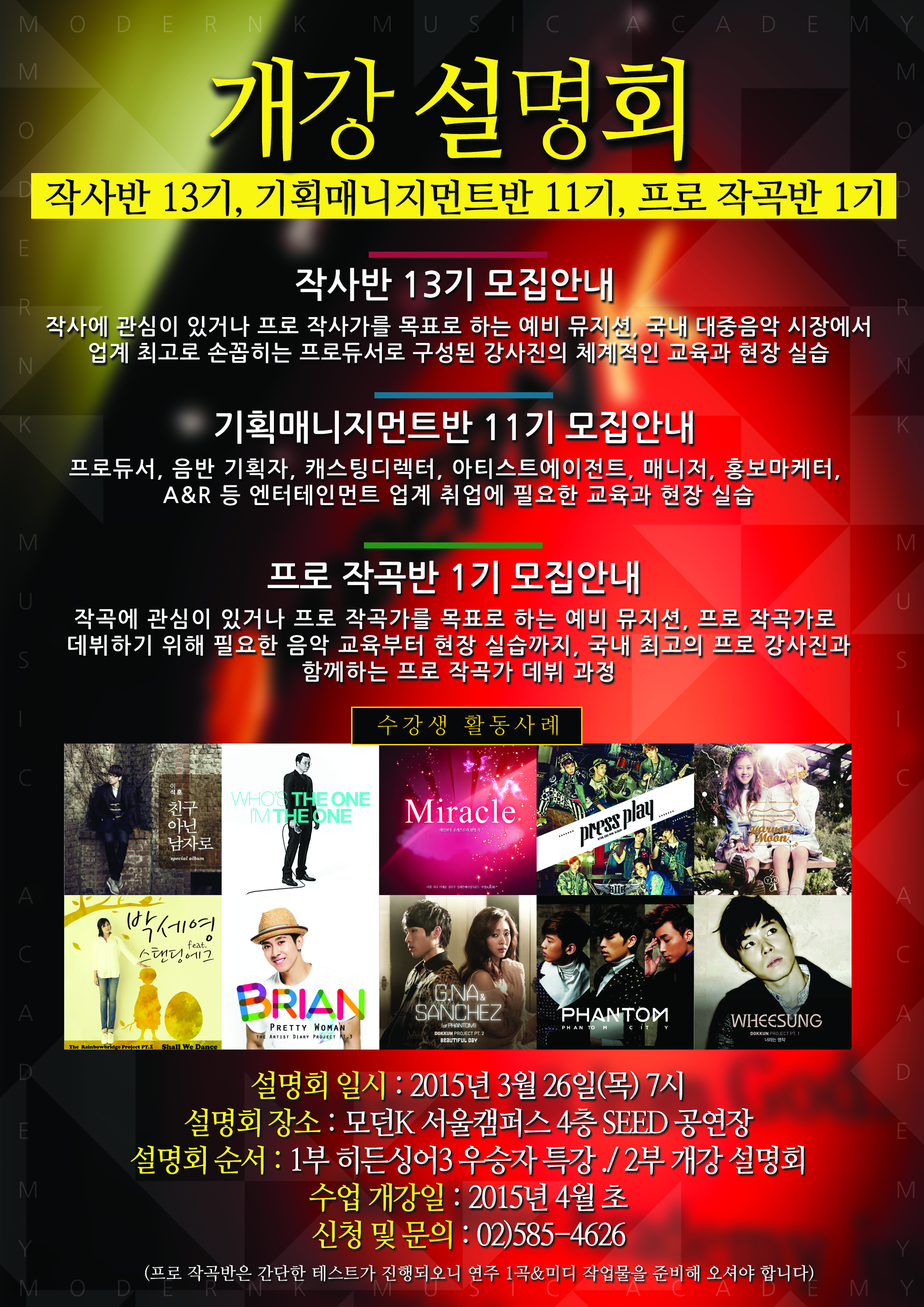 3월 26일(목) 오후 7시 부터 작사반, 기획매니지먼트반, 프로작곡반 개강 설명회가 진행 됩니다.