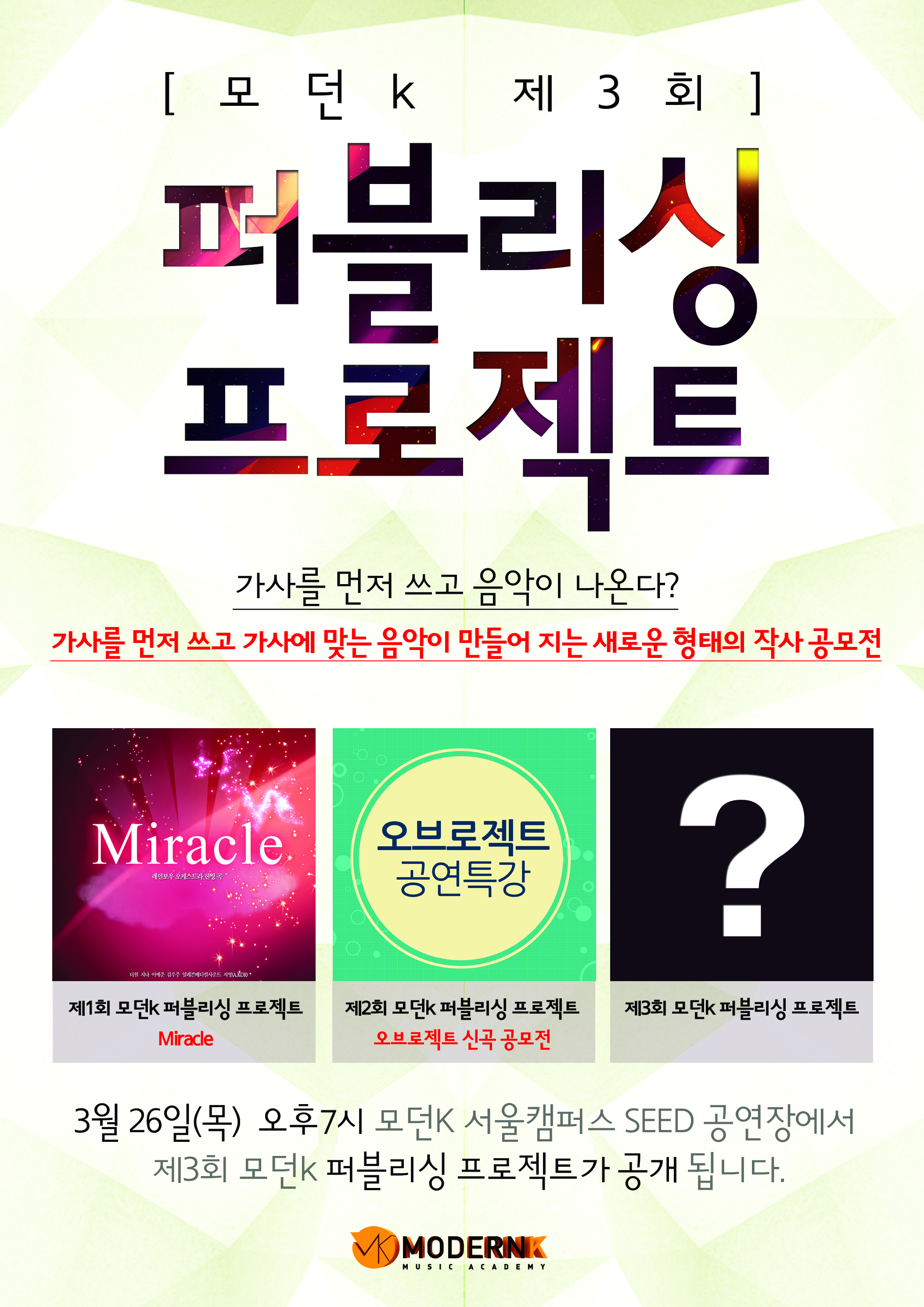 3월 26일(목) 오후 7시 모던K 서울캠퍼스 SEED 공연장에서 이번 제3회 모던K 퍼블리싱 프로젝트에 대한 공지가 진행 될 예정입니다.